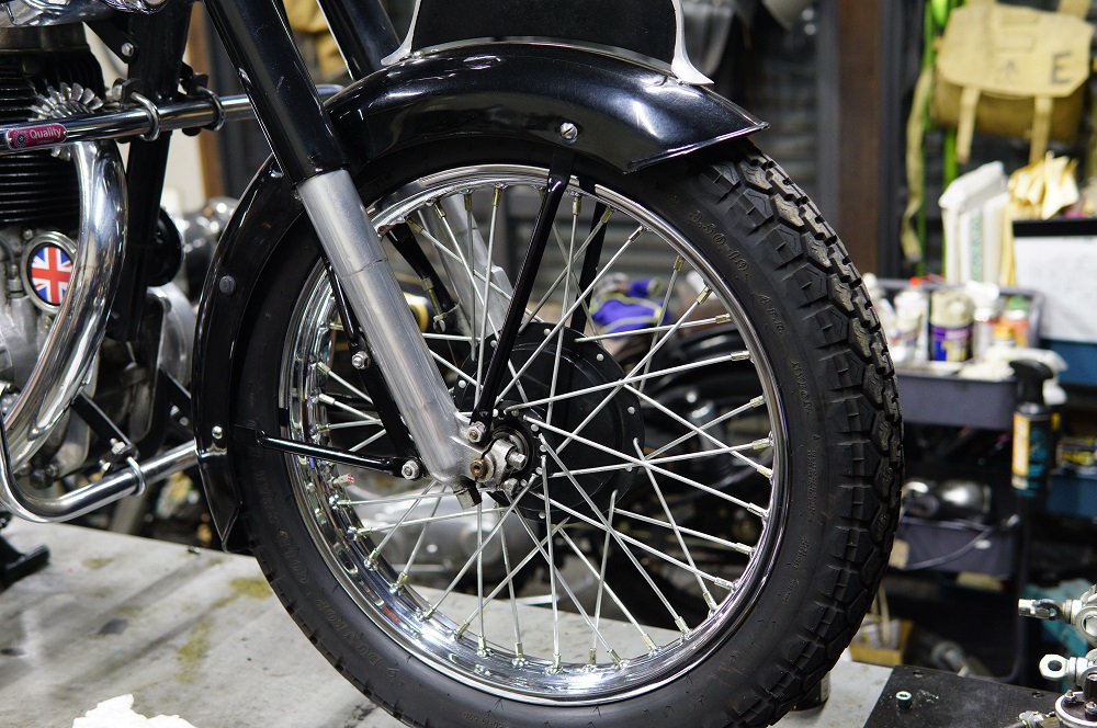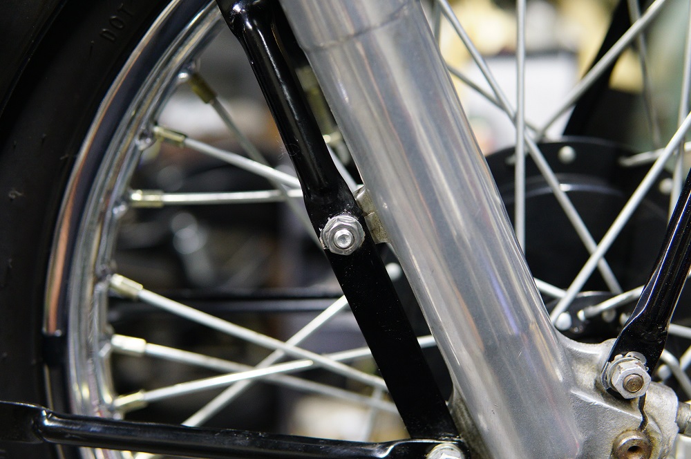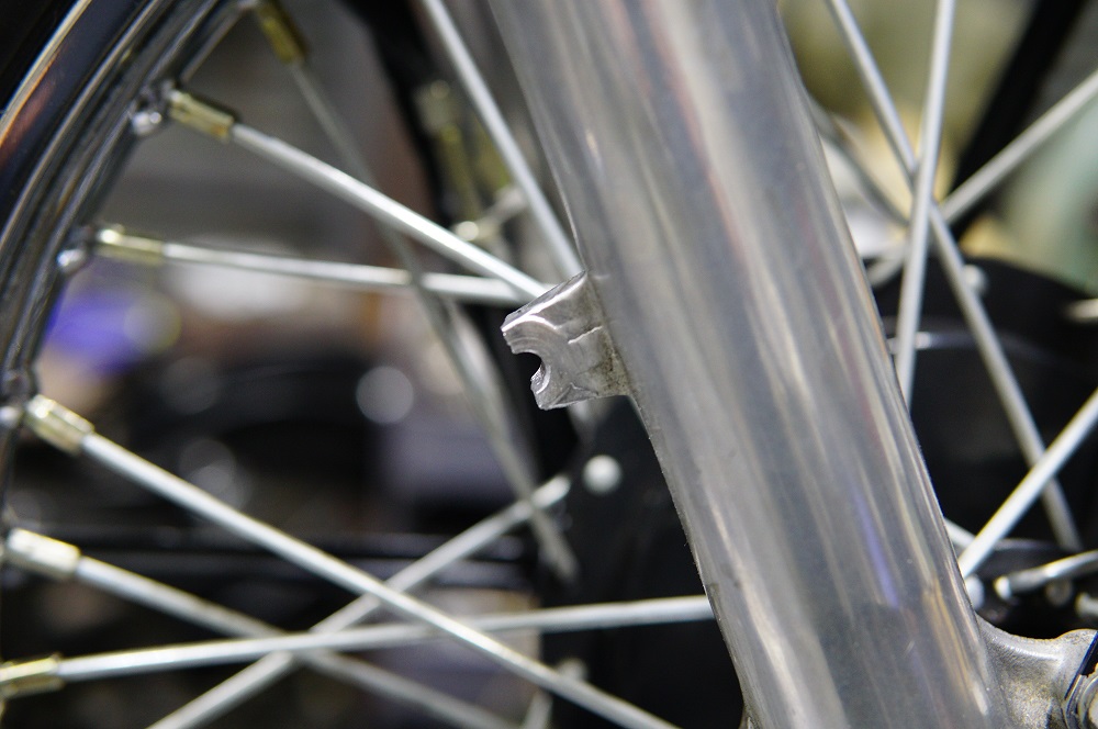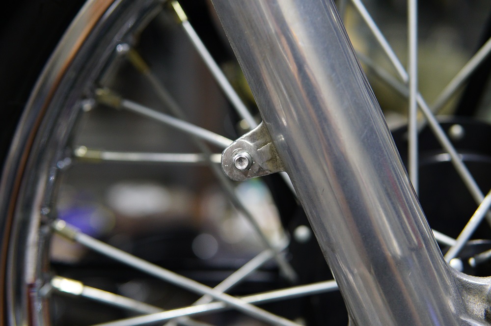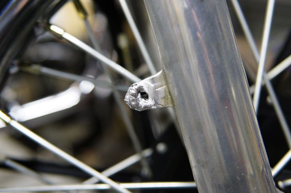 ロイヤルエンフィールド フォークアウターのステー修理 2025/08/26 ロイヤルエンフィールド アイアンモデルのフロントフェンダー こちらら純正ディープフェンダー。珍しくなってきましたね たま~にポリっと無くなってる事がある、フェンダーステーを留める部分 これ どうしようか少し悩んで、一番手っ取り早く直る方法にする 溶接で盛る 削ってボルトのネジ山立てて 完成 真似する人はフォーク本体に熱が入らないように注意!