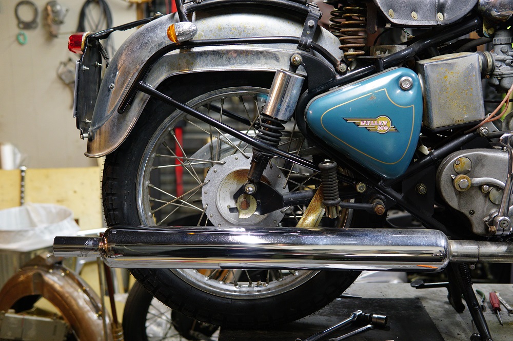 ロイヤルエンフィールドのリアフェンダーを手直ししてカッコ良くしよう 2026/02/19 珍しい純正ディープフェンダー サイドの部分の下のラインが真っすぐぽい感じで後ろ上がり。これを水平ぐらいにしたいというご依頼 センターが出ている事がほとんど無い、アイアンBULLETの後ろ姿 新車ま100%もっと傾いでて、酷いのはタイヤと擦ってました これはだいぶマシ、でも直したいよね 溶接加工が必要です 目立たない部分なので、ペイントは補修で簡易的に済ませて費用を浮かします よし! よーし。 ありがとうございました