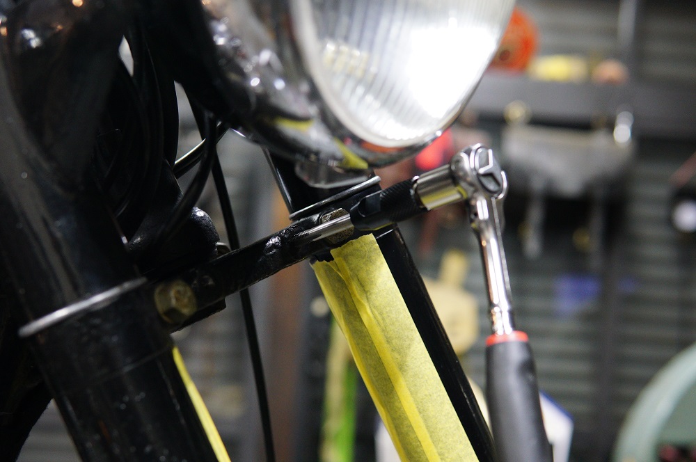 インド製のアイアンモデルでは無くなってしまっていますが、モデルGではアップフェンダーもダウンフェンダーも同じステムを使っているのか、加工は甘いですが受けがあります