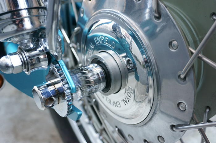 美しいバフ仕上げのアルミ製リヤハブカバーです